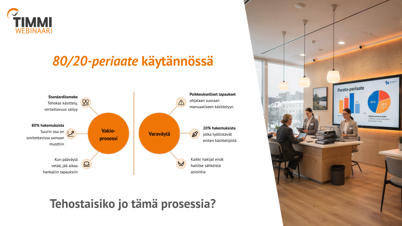 Sama ajattelu toimii avustushallinnassa. Kun valtaosa hakemuksista, se noin 80 prosenttia, käsitellään standardoidulla prosessilla, käsittelijöille jää aikaa ja osaamista hoitaa ne haastavat 20 prosenttia. Standardointi ei tarkoita jäykkyyttä, vaan sitä, että selkeä pääväylä vapauttaa resurssit sinne, missä niitä eniten tarvitaan.