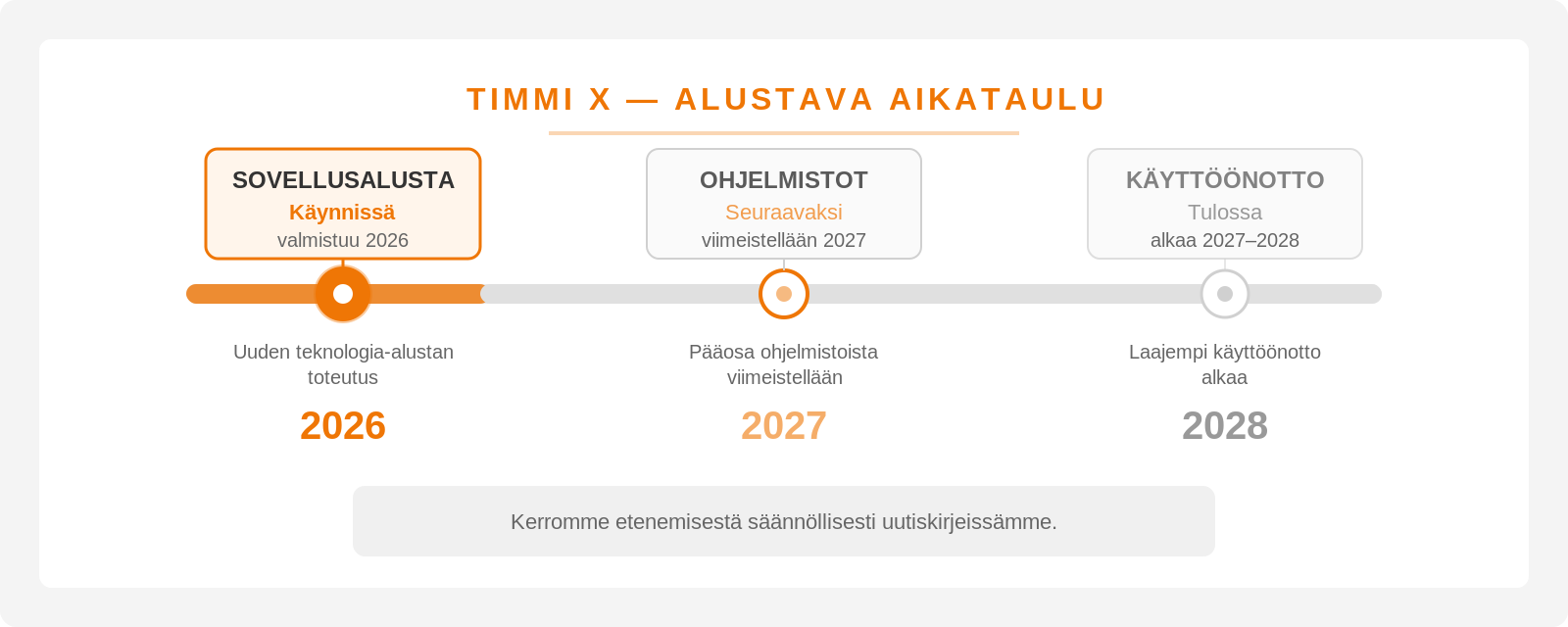 Sovellusalustan toteutus on käynnissä, ja se valmistuu vuoden 2026 aikana. Pääosa ohjelmistoista viimeistellään 2027, ja laajempi käyttöönotto alkaa vuosien 2027–2028 vaihteessa.